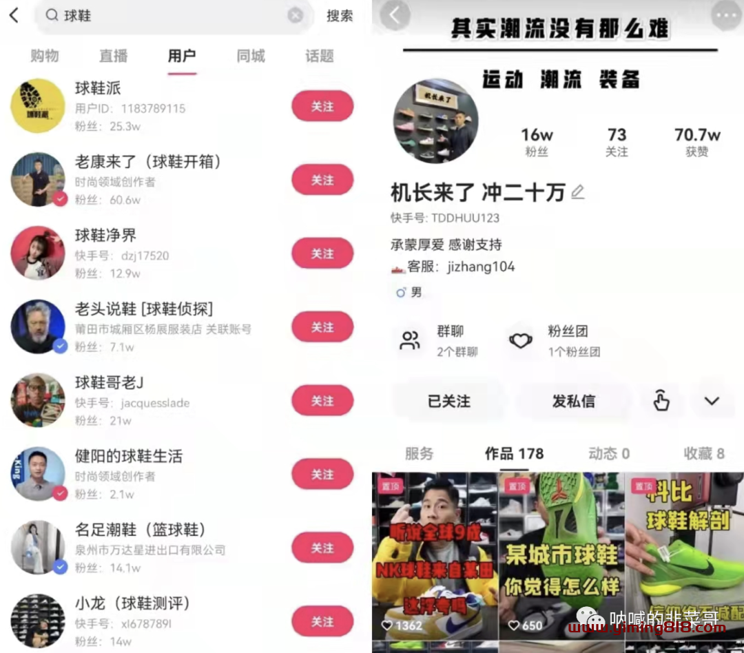 咱们呢这儿呢就用快手举例子,打开搜索球鞋,看到很多关于球鞋的用户,确定搬运搬运对象以后咱们返回得物,搜索下这个对象是否存在于得物作者![图片[1]-项目分享:冷门项目得物搬砖,单日100+-一鸣资源网](https://www.yiming818.com/wp-content/uploads/2022/03/aae47148d682.png)