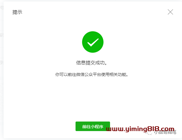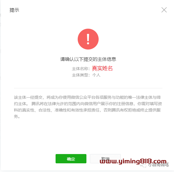 ⑧第八步,在输入了个人用户的姓名、身份证号后,还需要输入手机号验证码,再通过管理员手机微信扫描二维码进行确认。全部确认完成后,选择继续,会弹出确认主体信息提示框。再次确认后,信息提交成功,你就可以前往微信公众平台开发小程序了。
