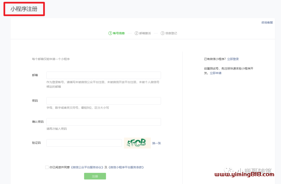 ③第三步,进入小程序注册流程–账号信息注册阶段。注册小程序需要未被微信公众平台注册,未被微信开放平台注册,未被个人微信号绑定的邮箱 ![图片[4]-副业项目之小程序源码去水印月入1000-一鸣资源网](https://www.yiming818.com/wp-content/uploads/2022/03/28fe9b5708e6.png)