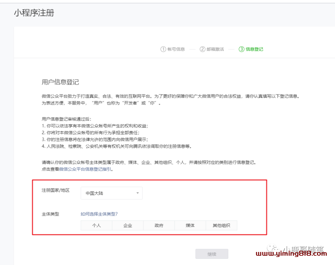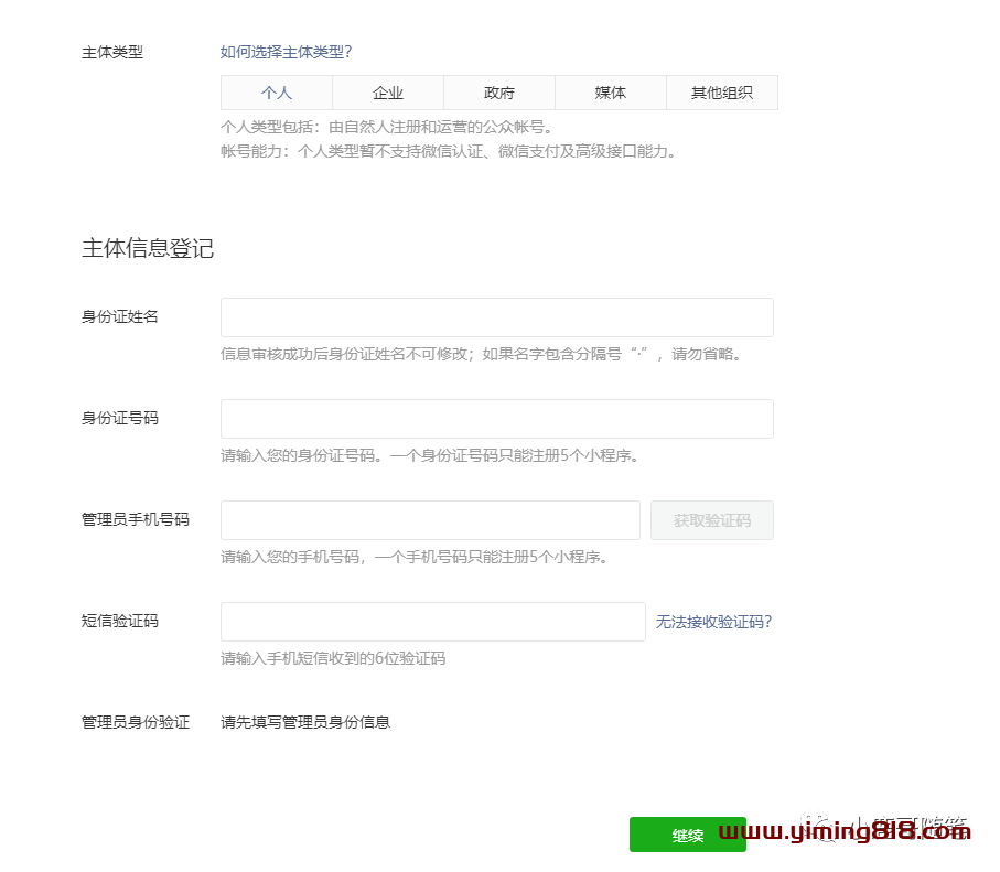 ⑦第七步,主体类型的选择。(注册小程序时,想清楚注册这个小程序的用途,来选择主体类型。中国大陆可供选择的主体类型有个人、企业、政府、媒体、其它组织,不同的主体类型,需要准备的资料也不同。)我们这里以个人账号的注册来说明。如图![图片[8]-副业项目之小程序源码去水印月入1000-一鸣资源网](https://www.yiming818.com/wp-content/uploads/2022/03/3fcfe928b93d.png)