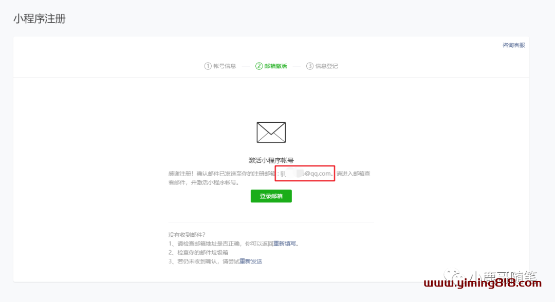 ④第四步,激活公众平台账号。在上一步输入注册账号后,进入下一步“邮箱激活”,需要登录注册邮箱激活账号。如图![图片[5]-副业项目之小程序源码去水印月入1000-一鸣资源网](https://www.yiming818.com/wp-content/uploads/2022/03/ab632914e1bd.png)