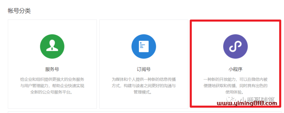 ②第二步,在弹出的注册页面,选择“小程序”注册,如图