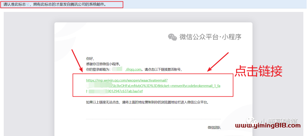 ⑤第五步,登录邮箱,点击链接激活账号。进入邮箱后,会收到一个微信公众平台的邮件,打开并点击链接激活账号即可。如图![图片[6]-副业项目之小程序源码去水印月入1000-一鸣资源网](https://www.yiming818.com/wp-content/uploads/2022/03/e32cb353adb3.png)