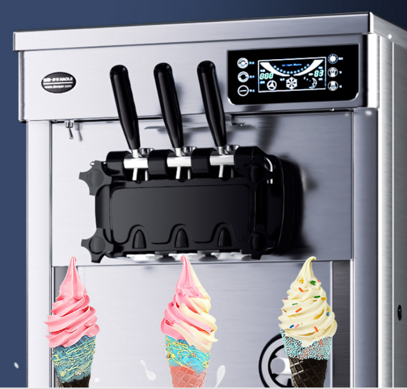 出料口有单头的还有双头和三头的,单头的就是一个储料缸及制冷缸,一个出料口只能出一种颜色及口味的冰淇淋,适用于人流量少的场所,而三个的是两个储料缸和制冷缸,同理,可以出三个口味和颜色的冰淇淋,比较适合专一做冰淇淋的门店及人流量大的地方。