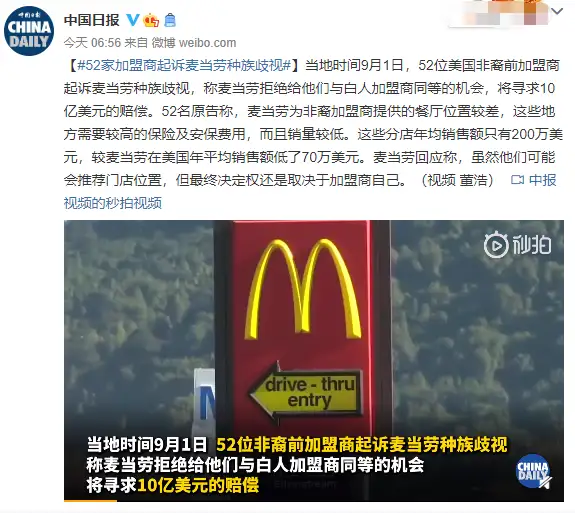 据外媒报道,当地时间9月1日,52位美国非裔前加盟商起诉麦当劳,指责麦当劳存在种族歧视,拒绝给他们与白人加盟商同等的机会,将寻求10亿美元的赔偿。