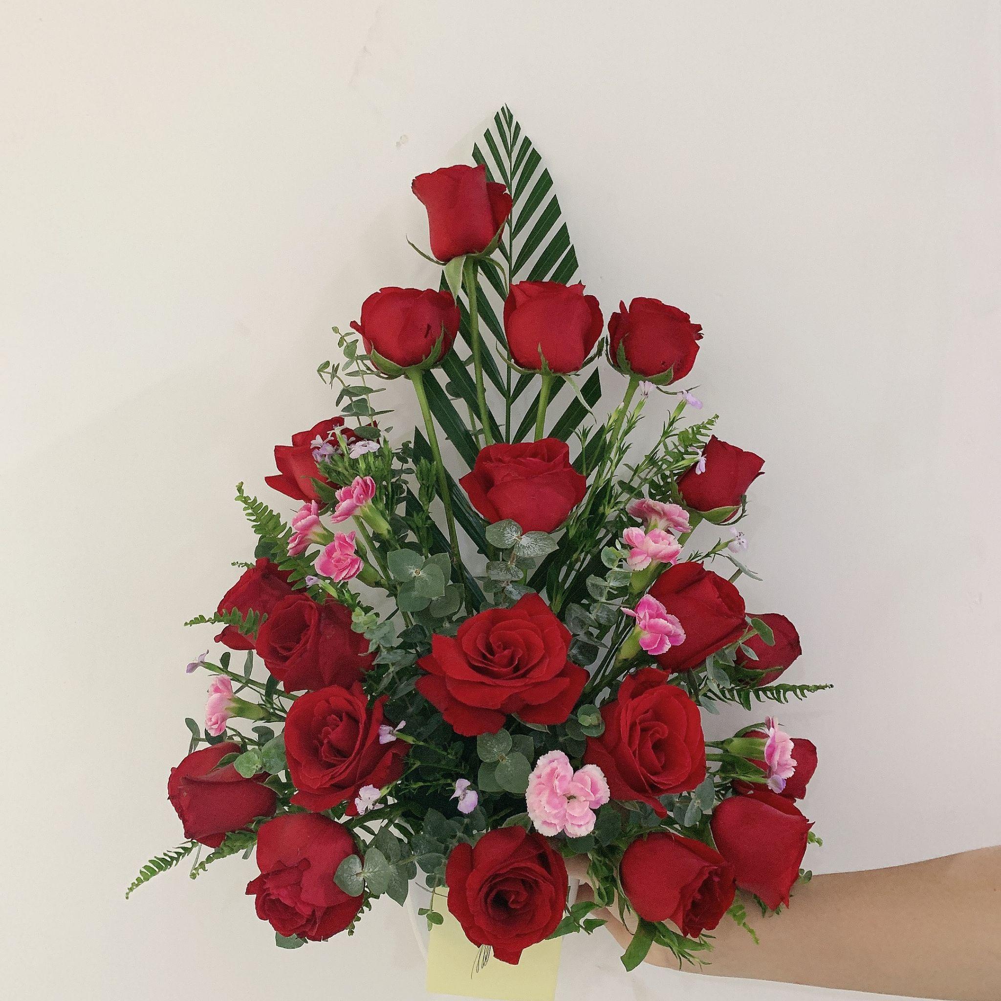 哇这一束是我扎过最满意的花花啦,送给长辈生日的,晚上下班直接去花店选花材包的,依然是我最喜欢的荔枝玫瑰搭配红玫瑰,加上适合送长辈显贵气的金红色两面水粉纸,真的好喜欢它啊啊啊啊啊啊