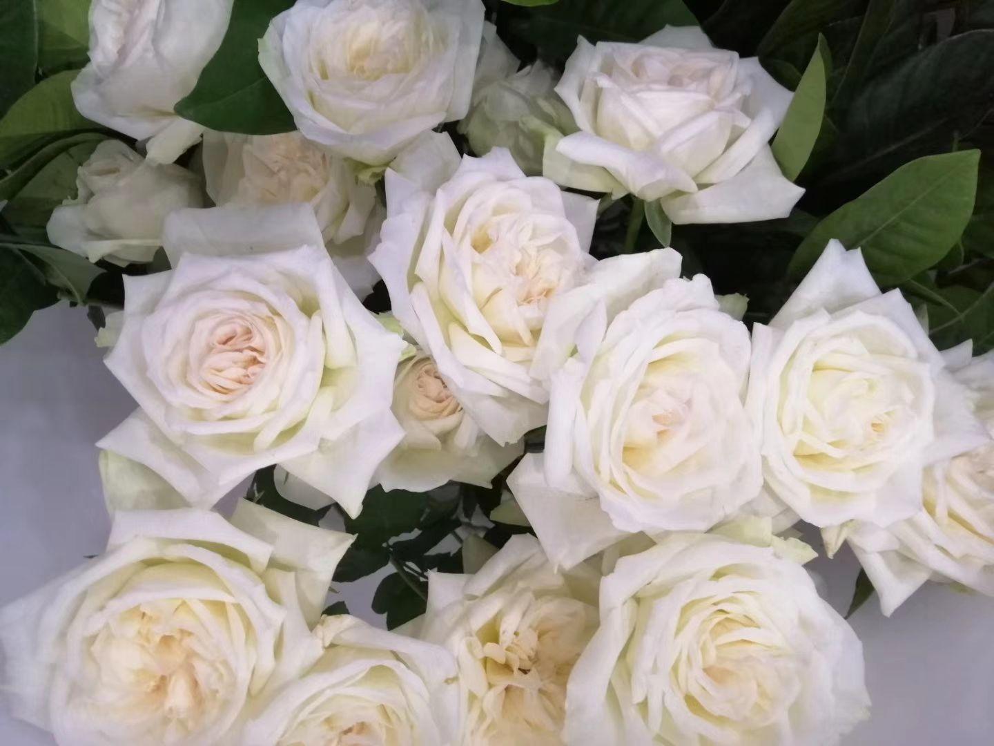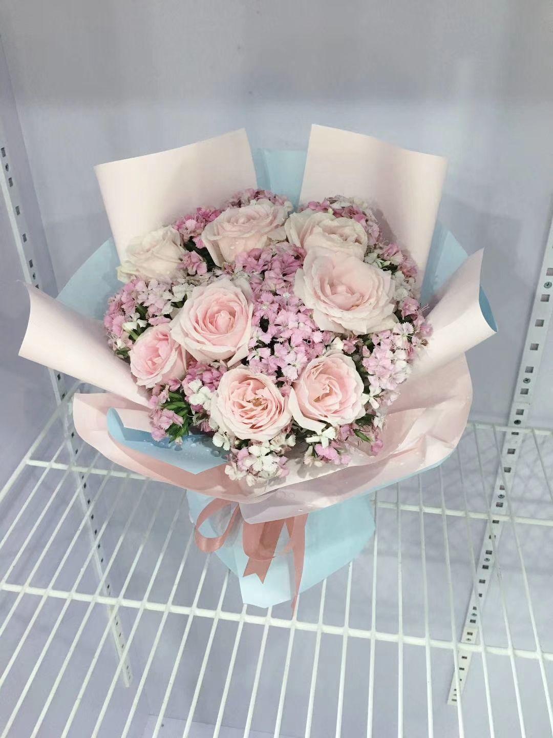 香槟玫瑰和蓝色包装纸搭配最好看了
