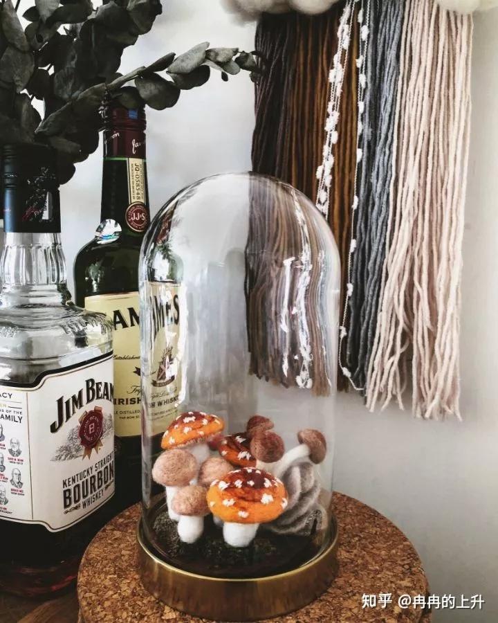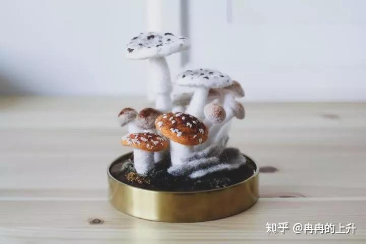 比如蘑菇盆栽中,每朵蘑菇戳好形状以后,表面用线绣出斑点,蘑菇背面缝制了菌褶,底座上咖啡色的不织布上绣满黄绿色苔藓;黑白系动物挂饰中,戳制小动物相对比较写实,所以整体的体型比例很难拿捏,这个作品前前后后调整了一个月才最终组装完成。