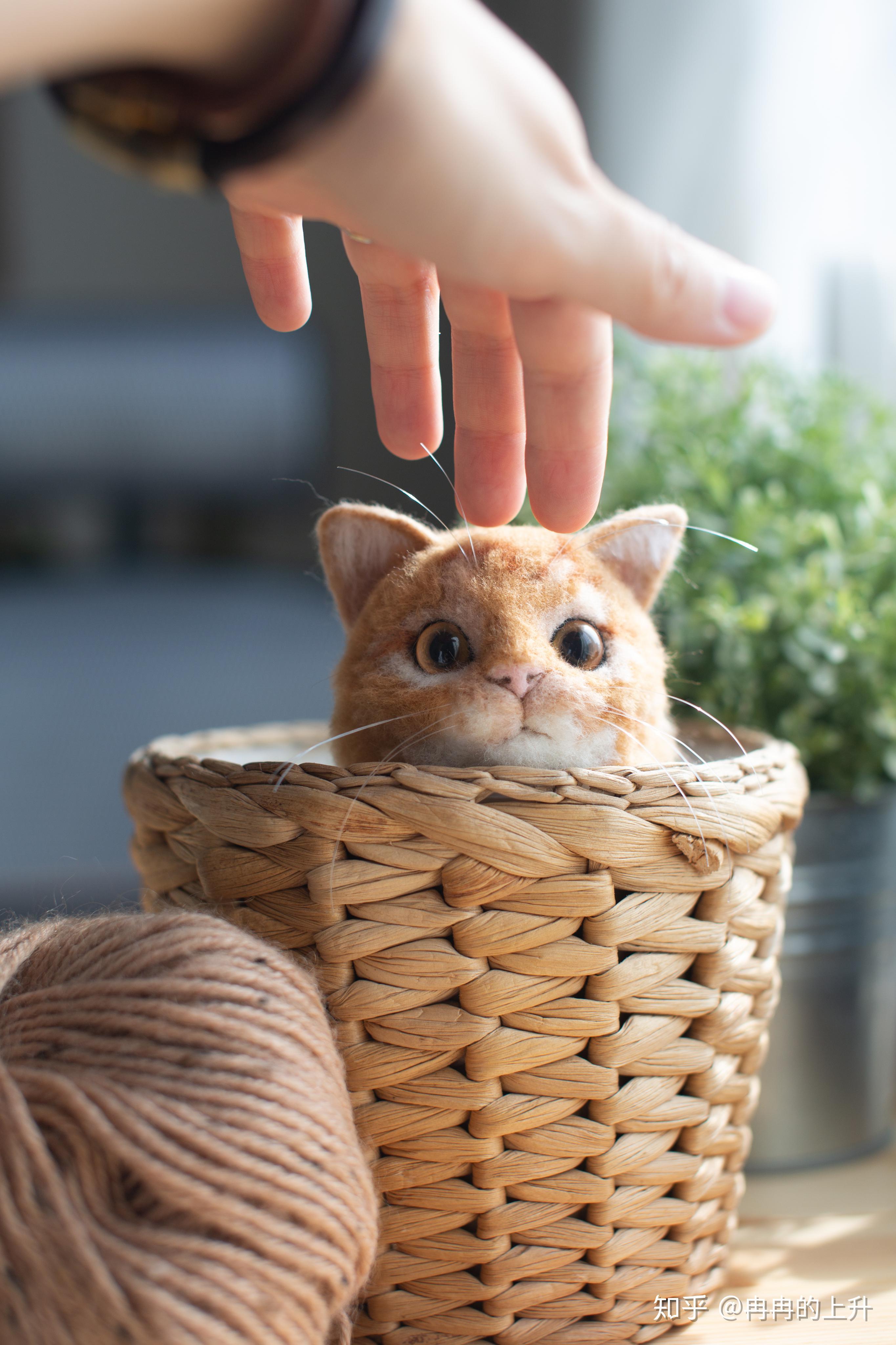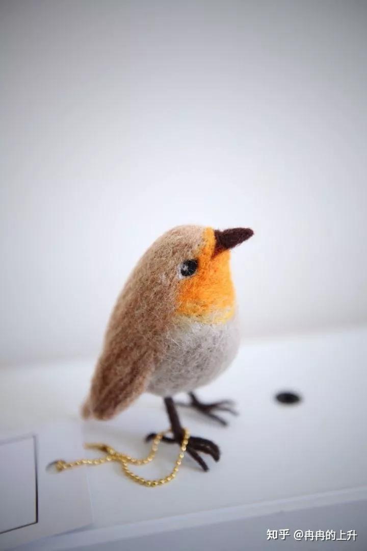 后来慢慢开始尝试混色、复杂形状的塑造,以及多种材质的拼接,比如毛毛虫的身体用了几种羊毛的混色和拼接;知更鸟的腿部用了细铁丝缠线,然后再连接到羊毛毡身体上;小猫尝试了内嵌了眼睛及植毛技法。