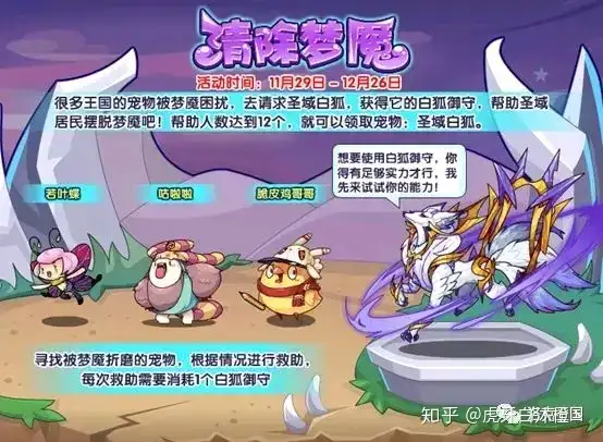 很多王国的宠物被梦魇困扰,去请求圣域白狐,获得它的白狐御守,帮助圣域居民摆脱梦魇吧!帮助人数达到12个,就可以领取宠物:圣域白狐。