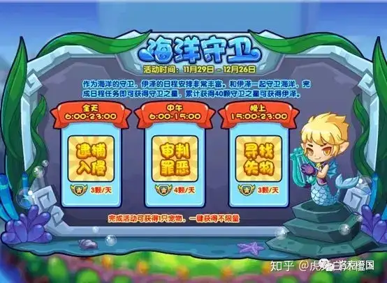 作为海洋的守卫,伊泽的日程安排非常丰富。和伊泽一起守卫海洋,完成日程任务即可获得守卫之星,累计获得40颗守卫之星即可获得伊泽。