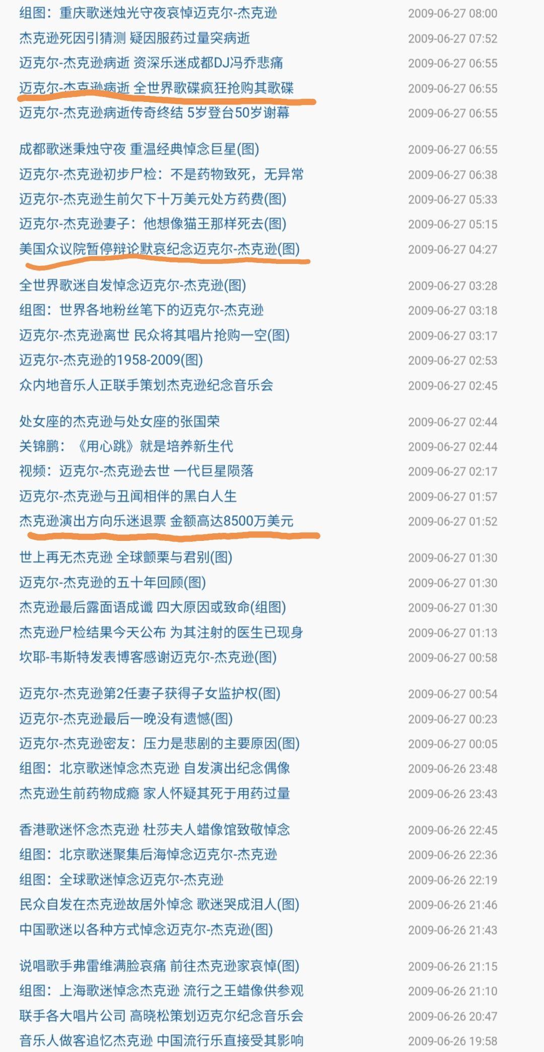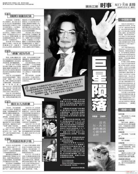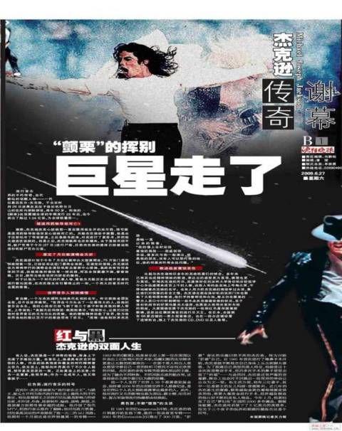当时好几家网站一打开,网页上面的诺大一张图片就是悼念迈克尔杰克逊。因为时隔很久,网页是经常换主题的,现在没办法截图当时的景象了,因为那个时候看到都来不及震惊,谁会在那个这么悲痛的时候去截图呢?但是国内的纸媒还可以保存,这些是一些迈迷留下的报纸图片: