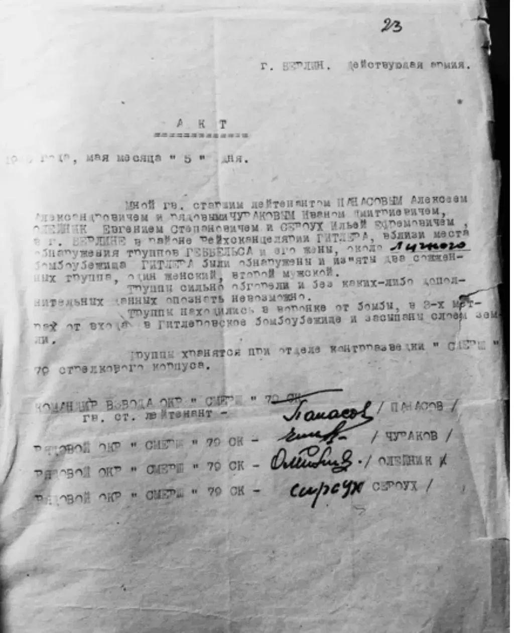 希特勒已死的消息被发布后,苏联人开始搜寻希特勒的尸体,以证明他确实已死,而不是逃脱了。