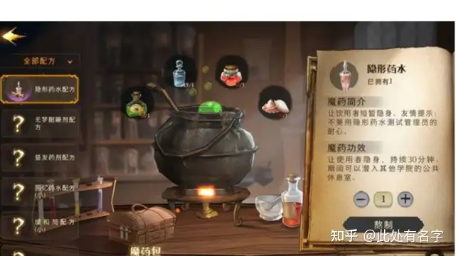 (魔药界面,右下角“学分商店”购买“隐形药水配方”和材料,制作隐形药水。饮用方式:点击魔药包进行饮用)