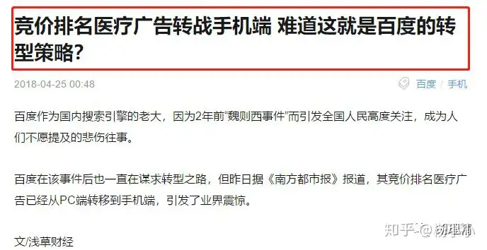 上个月,根据《南方都市报》报道,百度医疗广告竞价排名从pc端转向了手机端。