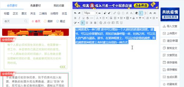 别人的文章排版不错想借鉴,或者内容想引用,但是复制太麻烦,直接导入到365编辑器,原汁原味,方便快捷,还支持文档导入,免去复制的麻烦。