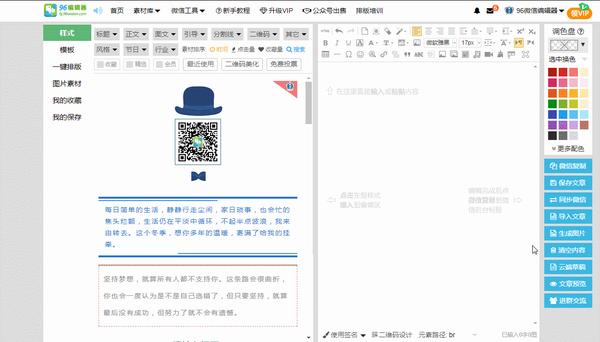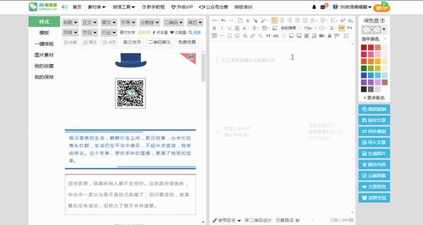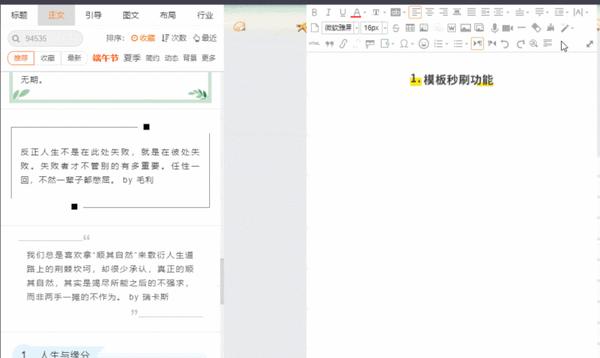 135编辑器的独家秒刷功能也是骚的不行,将你的文字内容(图片也行)直接放入编辑器,选中之后从左侧选择您要的模板,点击一键将你的内容变成模板效果,免去手动粘贴替换的麻烦(全文模板不支持此功能)。