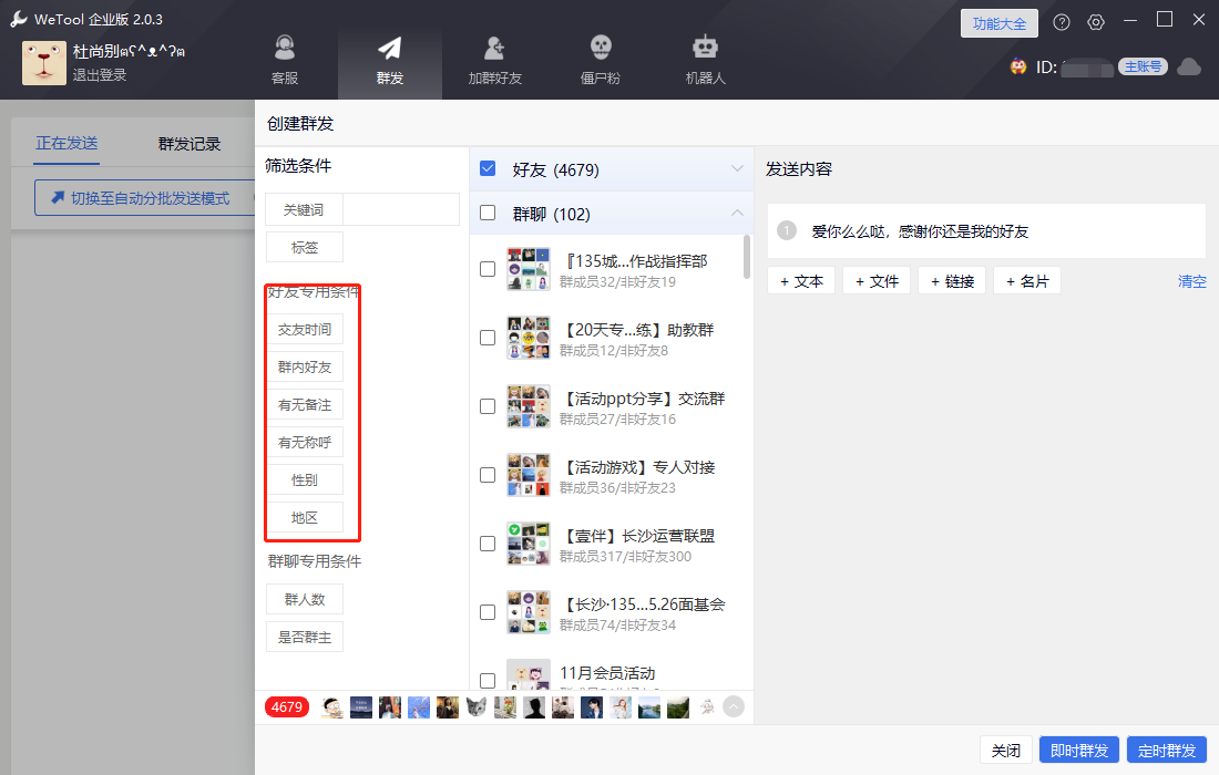 都知道微信群发仅支持200人,那超过200人的话,你一个一个找,一系列操作低效而又繁琐,这个wetool,不仅支持一键全选群发,还能选择性别、标签、群聊等,那些专门用来发广告的营销号,是时候用一下这个了。