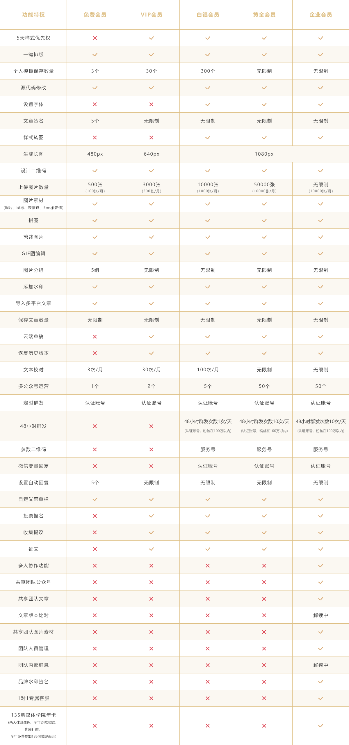 135编辑器是公众号编辑器的活化石,10个运营人有7个用过135,现在的135功能也越来越多,尤其是认证公众号的功能,大家可以参考下面的表格来选择他们家的服务。
