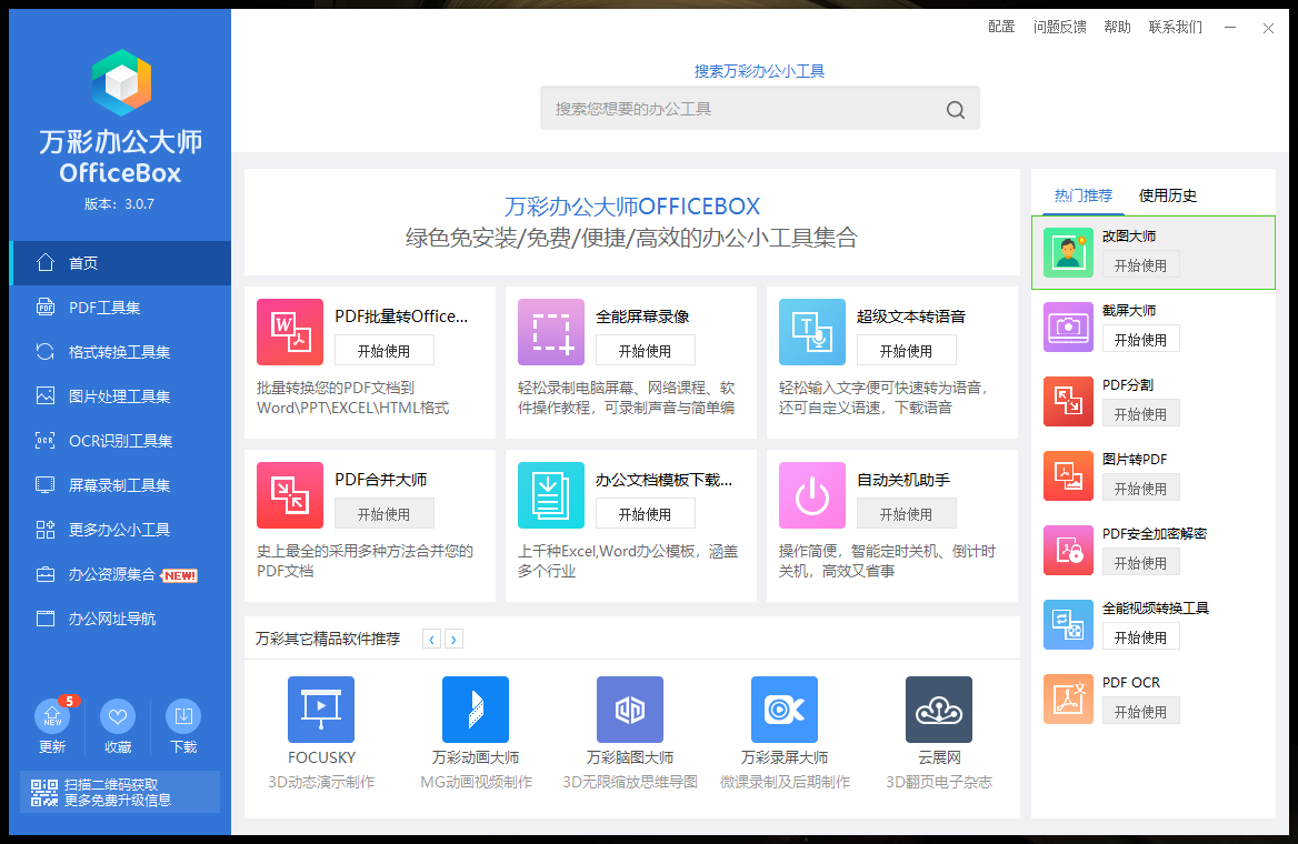 录屏神器用万彩、文档转换用万彩、格式转换用万彩、动画剪辑用万彩、脑图创建用万彩,没有想不到的,只有你用不到的,图片修改、文字识别,应有尽有,真的太太太太太太太**好用了!