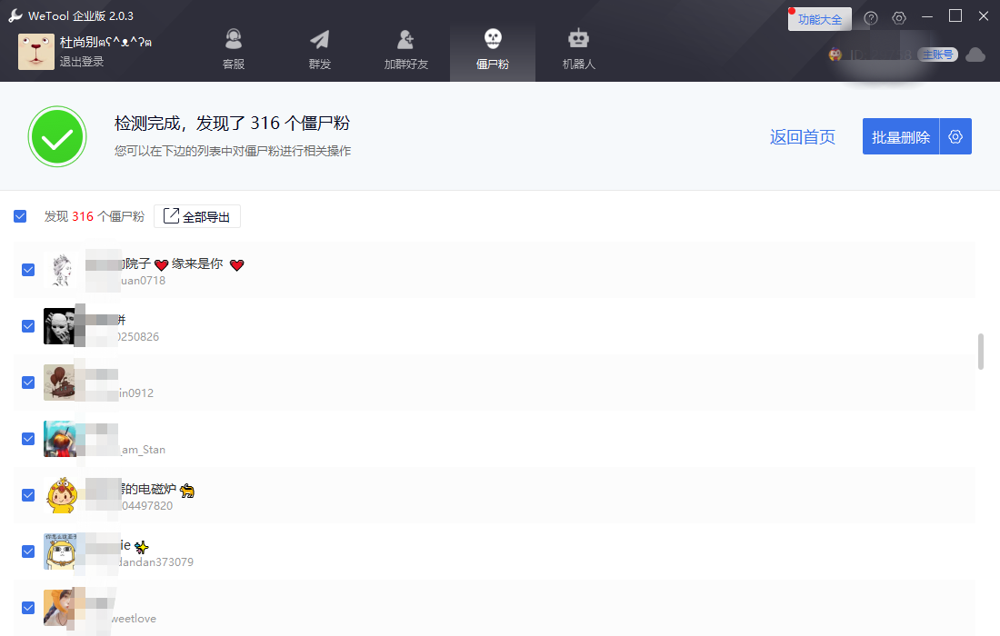其实清理好友有很多种方式,最傻逼的就是直接发一条消息告诉你,我在清理好友。这个wetool清理好友完全无痕,最后可以一键删除这些不要你的人,但是相对于某宝的清理服务,这个还是差点火候,我5000人的微信,清理了一天一夜。