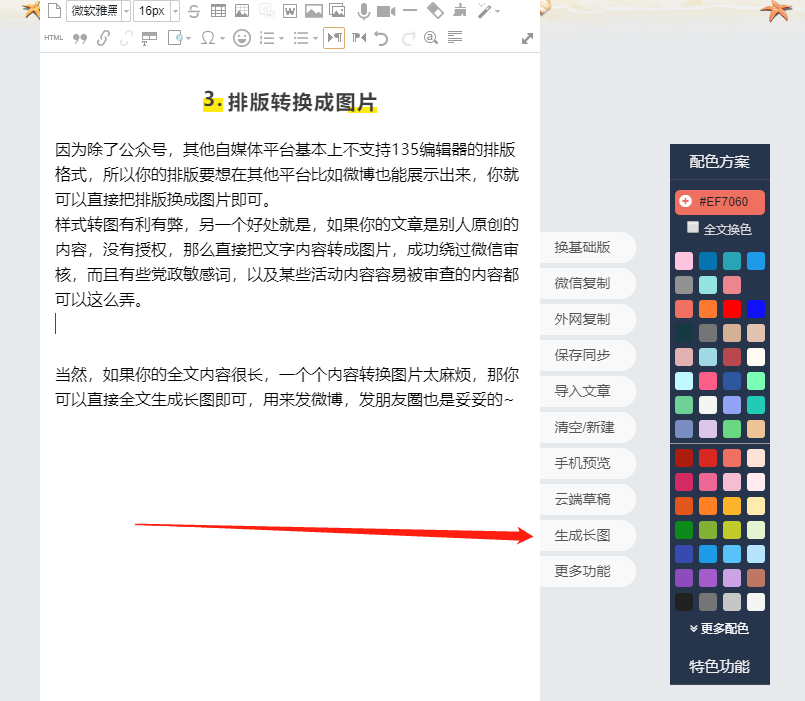 全文转为图片可以将排版好的文章转为一张图片,用于发布朋友圈或者微博等其他平台,方便保存,发给其他人预览效果。