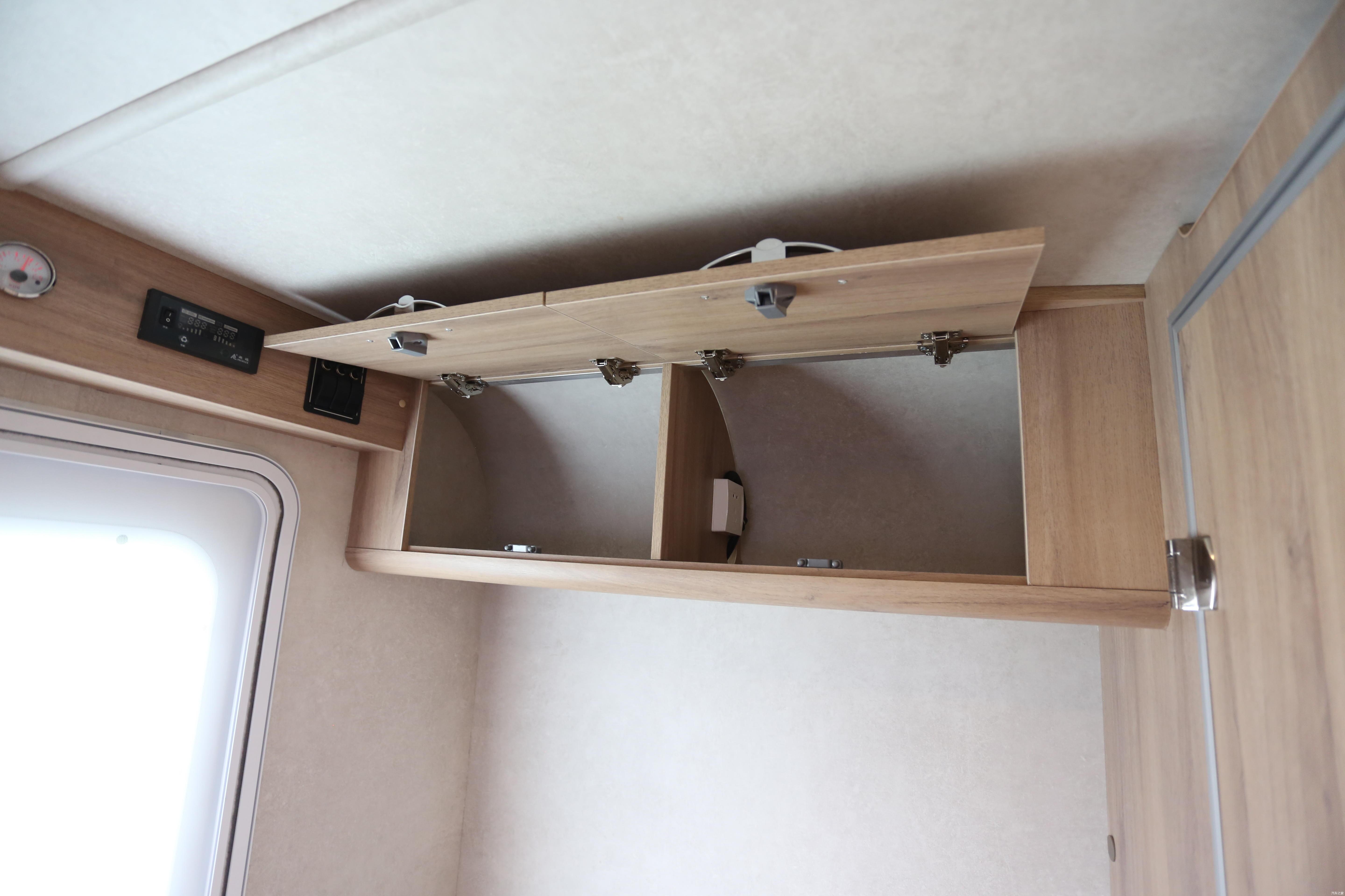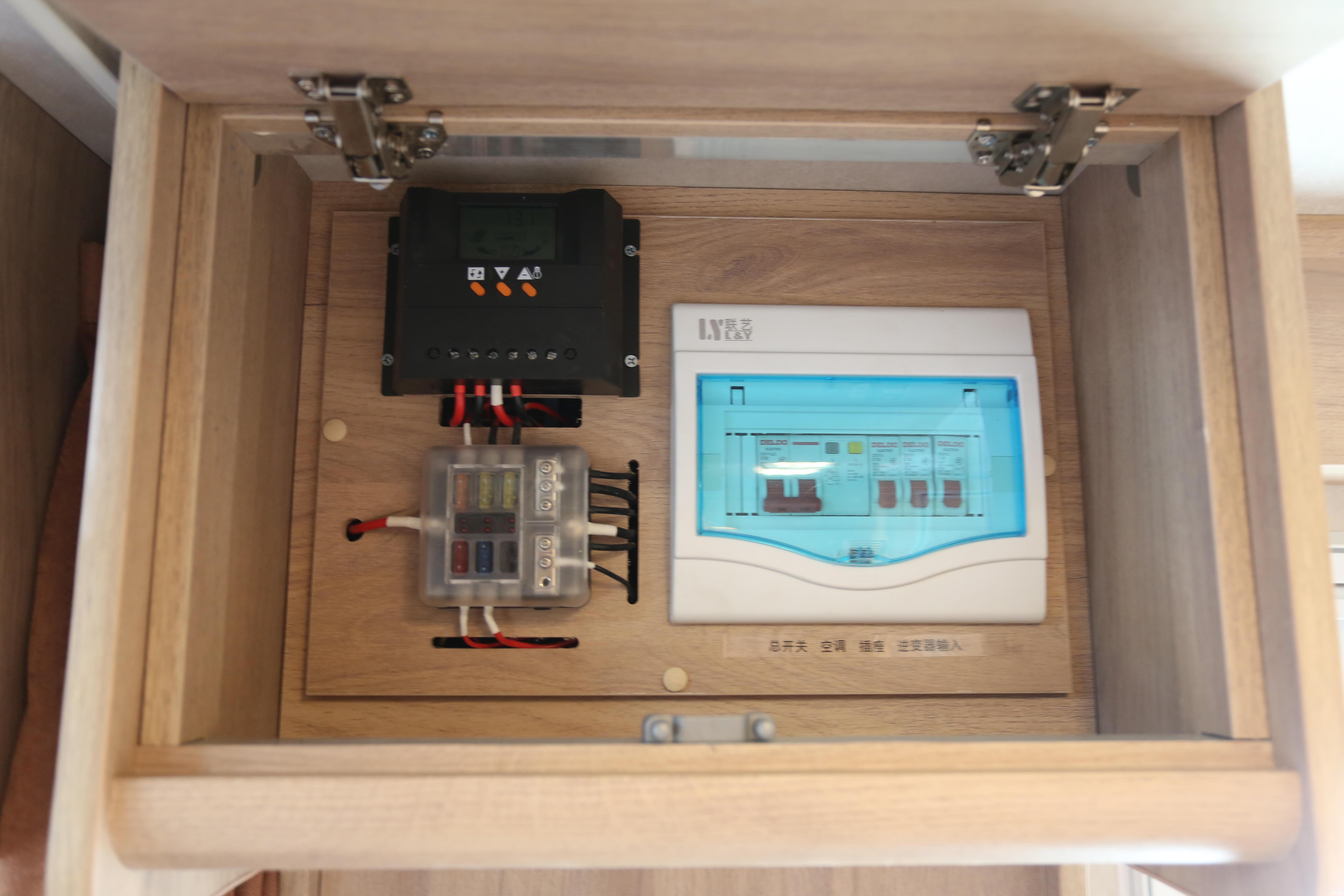 车门上方是这辆拖挂房车的控制面板区,可以查看水位,控制水电。该车净水箱90升,配有1500W逆变器,100Ah胶体蓄电池。