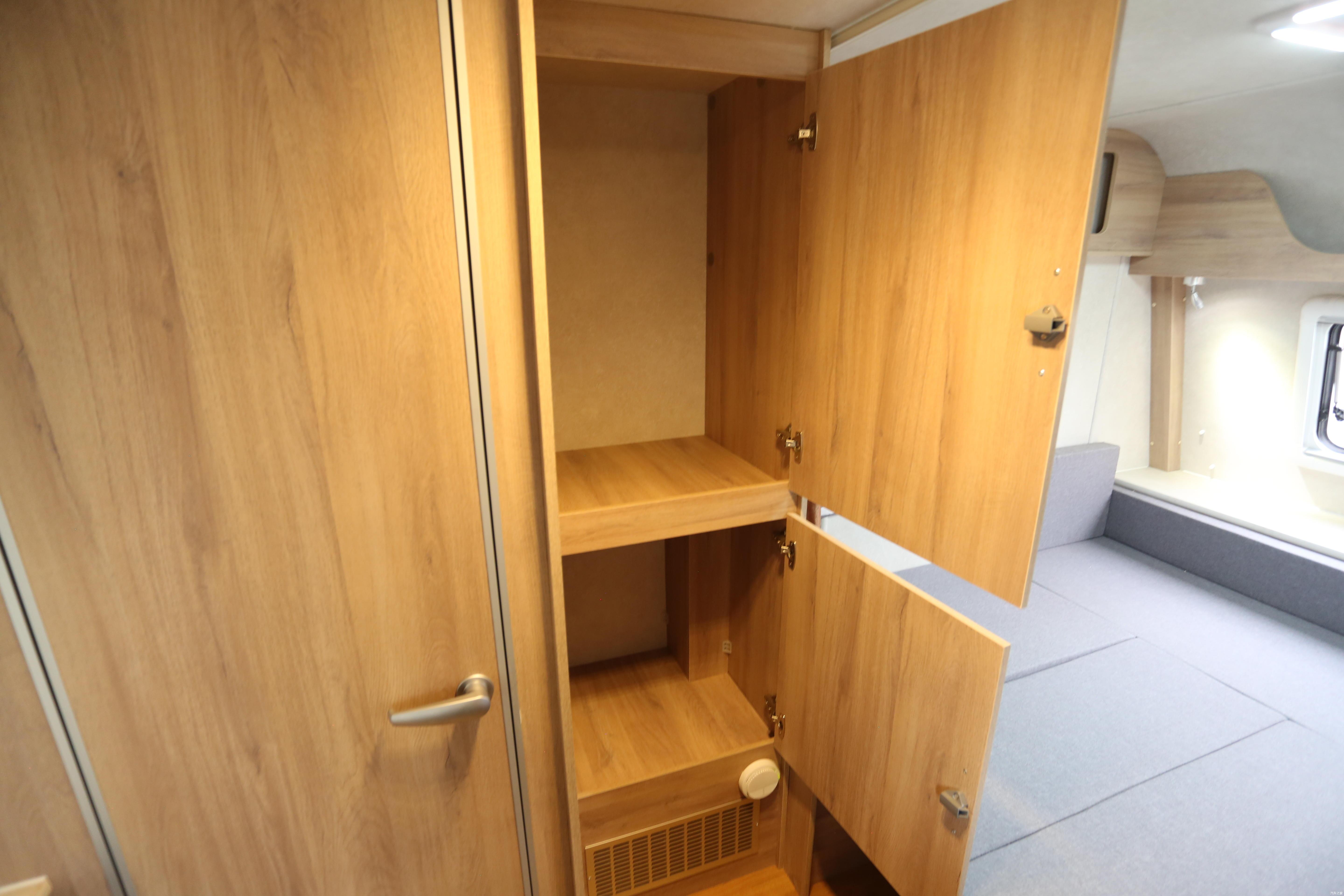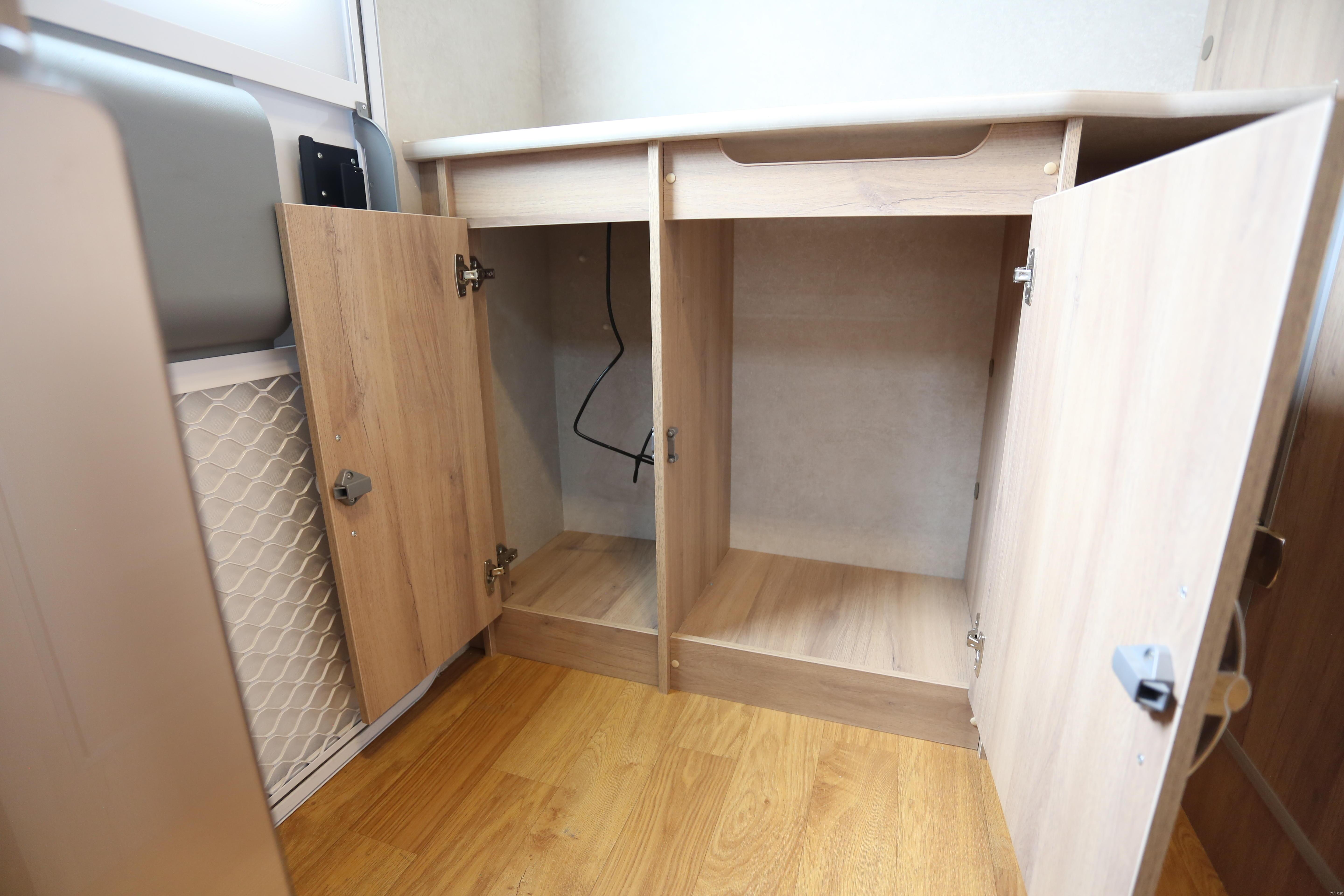 前设备舱右侧配有燃气热水器,插上电就能在房车内洗上热水澡了,左侧配有燃气罐固定绑带,中间还有很大的空间,可以放一些行李物品。