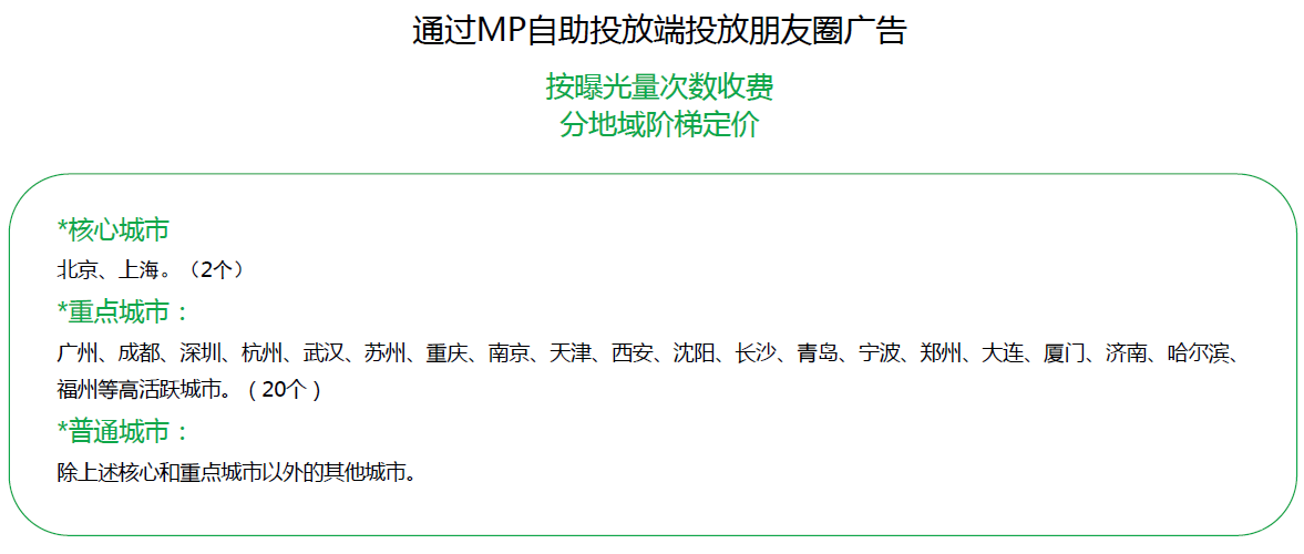 排期购买:提前预定排期,锁定目标曝光量(保量);CPM单价按刊例价执行;单次投放总预算5万元起;向所有城市开放;适用于所有朋友圈广告形态。