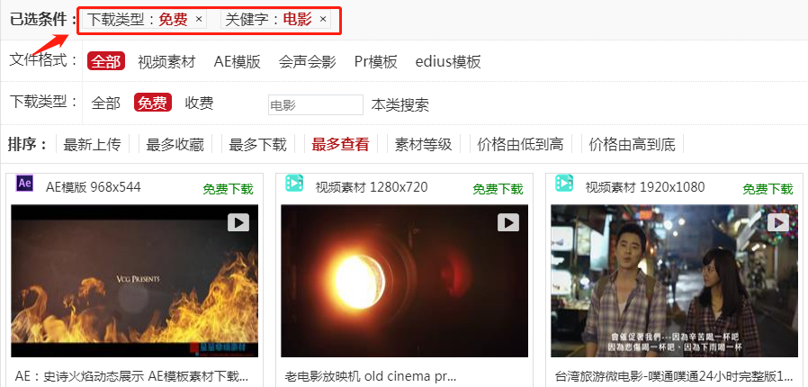 例如我们筛选类型为“免费、电影”后,就可以看到不仅有相关的视频素材,还有相关的各种视频模板,足以满足你的视频制作需求!【点击下载】PS:同样需要登录才能下载最高清晰度视频。