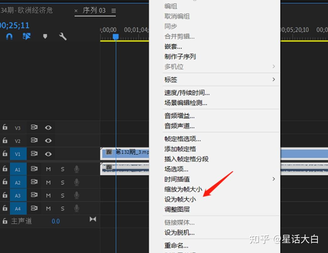 这个时候,我们只要右键素材,然后点击“设为帧大小”就可以把画面调整为,横版视频居中的竖版模式。