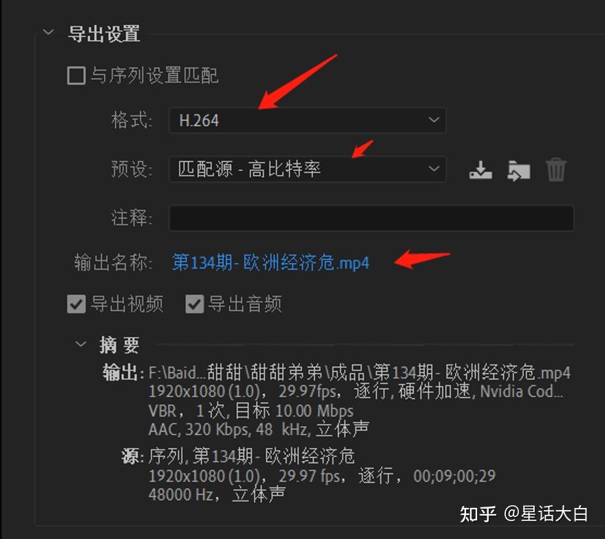 导出设置里,正常格式是选H.264,预设选匹配源。