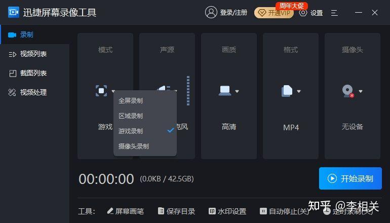 除支持常规的屏幕录制外,还有专门的游戏录制与设备录制模式。