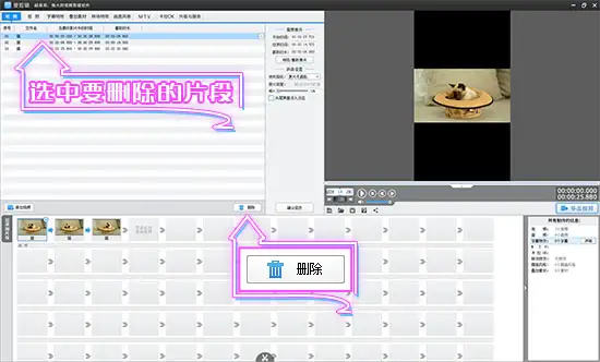 在分割时间点处,用“超级剪刀手”(快捷键“Ctrl+Q”)分割视频。把视频分割成多段后,删除多余片段,然后通过鼠标拖动“已添加片段”区域的视频缩略图,重新拼接截取的片段。