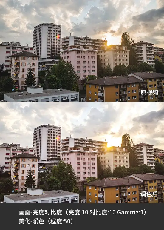 在应用“画面”-“亮度对比度”改善画面偏暗的基础上,叠加应用“美化”-“暖色”,就很好地展现出了夕阳西下的美景: