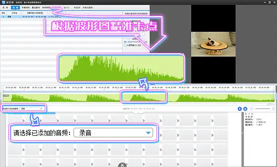 导入视频和背景音乐后,打开创新式时间轴,在时间轴面板左下角的“请选择已添加的音频”下拉框中,选择添加的音乐,面板上就会出现音频波形图。