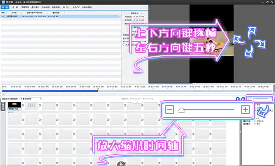 打开创新式时间轴(快捷键“Ctrl+E”),鼠标拖动时间轴面板上的滑块,定位到要分割的画面附近(此过程可结合“左右方向键”五秒微移选取画面),然后放大时间轴到最大(快捷键“+”),使时间轴上的每个格子代表一个帧,这时按定滑块左右滑动(快捷键“上下方向键”),即可进行画面的最细逐帧定位。
