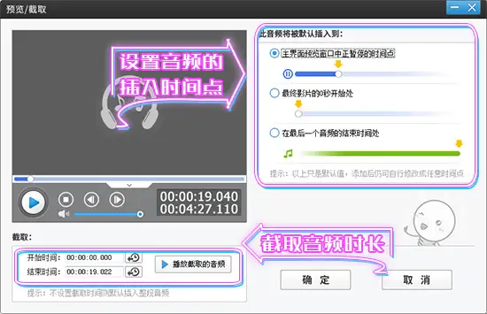 打开“音频”面板,点击“添加音频”-“添加背景音乐”或“添加音效”,选择音频文件并打开,在弹出的“预览/截取”对话框中,截取音频时长,同时在“此音频将被默认插入到:”栏目,选择音频在视频中的出现时间点。