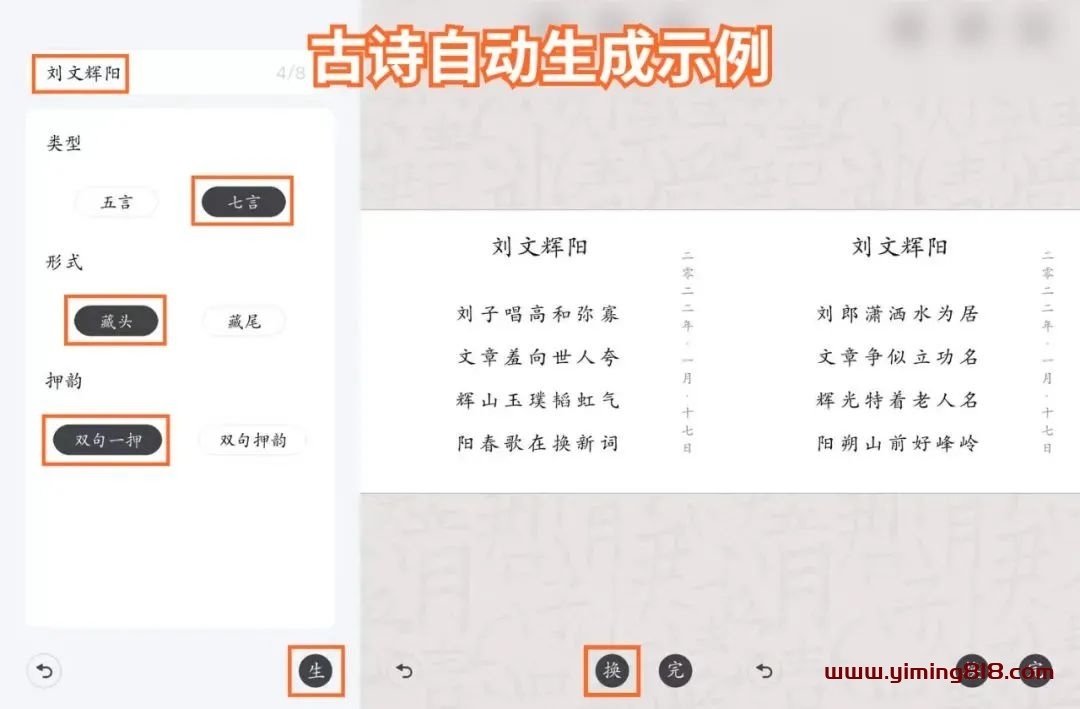 步骤3:观众打赏后,引导评论区发“名字+性别”。打开藏头诗生成器,输入“观众名字+任意1-2个常见字”,一般写4句→根据观众需求选择“五言/七言”→点击“生”,即可自动作诗。机器难免有Bug,偶尔会生成质量不佳的诗,可点击“换”,直到生成满意的诗为止。