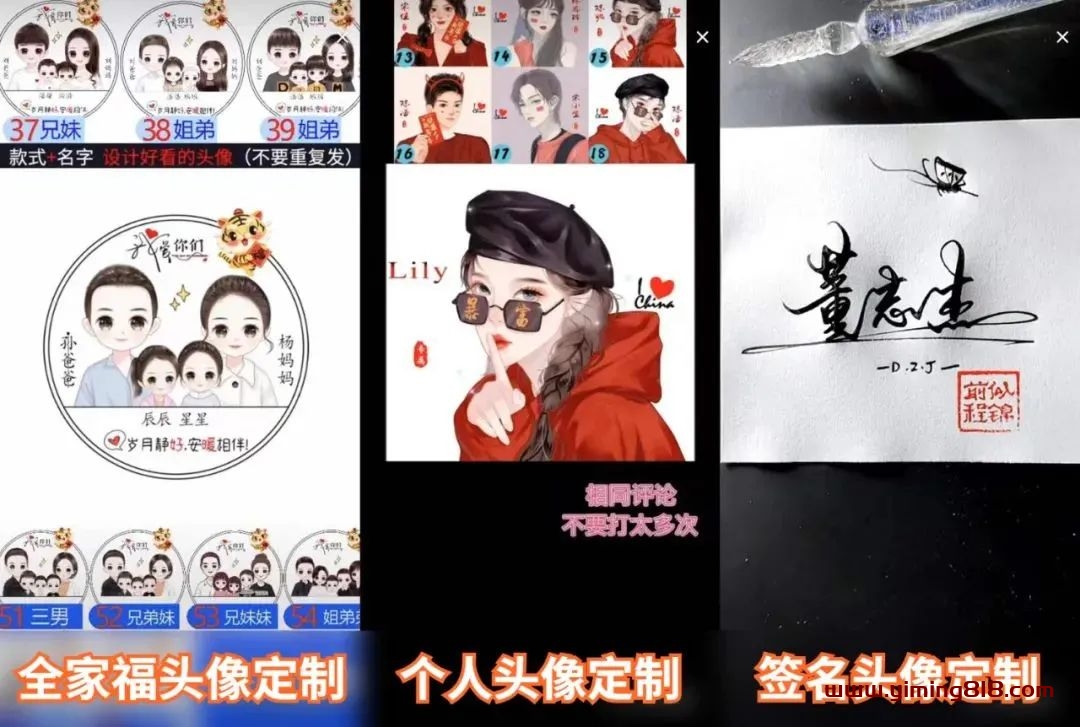 头像定制直播,包括全家福头像定制、个人头像定制、签名头像定制等。前2种比较简单,会PS基础操作、会打字即可。后1种要字好看或有绘画功底,有一定门槛,不推荐。老老实实做前两种即可。如图。