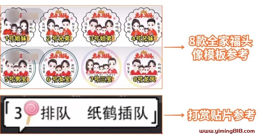 步骤2:打开PS,提前做好8张不同类型的全家福头像模板、1-2张直播打赏贴片。