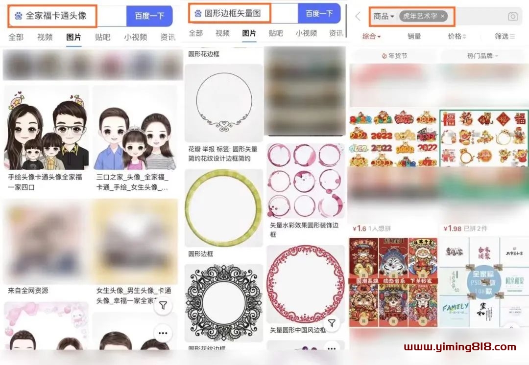 步骤1:准备电脑1台,手机1台,千粉抖音号1个,名称设置为xx头像定制/个性头像等。百度搜索“全家福卡通头像”,下载8张3-5口之家不同组合的白底图片;百度搜索“圆形边框矢量图”,下载1-2款外框;拼多多搜索“虎年艺术字”,购买若干款虎年元素素材。