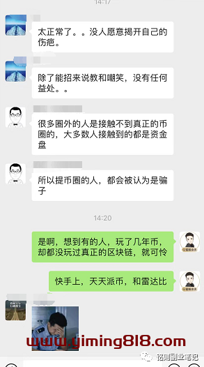 然后群主说了一句话吗,我很认同:就是有些圈外的人,玩了一顿,根本就没有接触到真正的币圈,也没有买过真正的虚拟b,没有真正的用过区块链,也没真正的尝试过去中心化