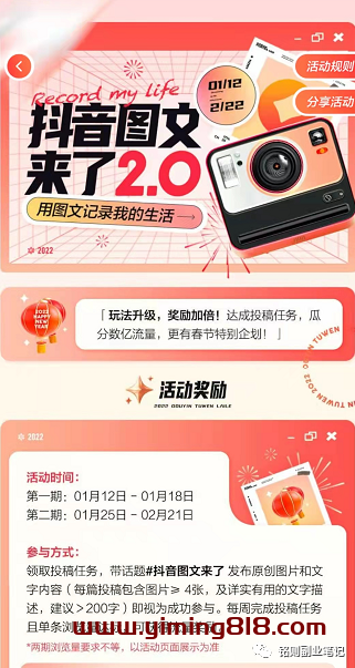 言归正传,之前我就说过抖音图文这次试水成绩不错后,肯定还会搞活动,果然抖音图文2.0活动,这就来了,也是有很多流量奖励,就算活动结束也没事,我觉得用不了多久还会出