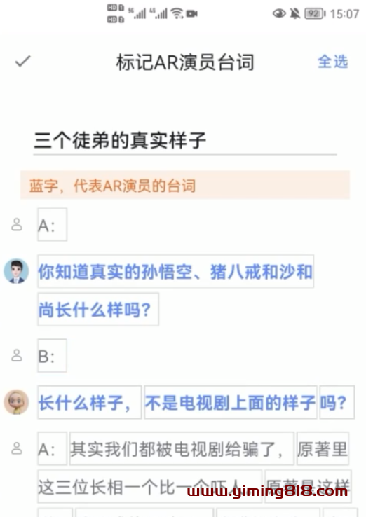 然后,用底部系统推荐的虚拟人物把每一个段落标注出来,哪一句话是哪个虚拟人物说的,这个标注方式非常简单,后台都有详细的教程,标注完之后,每一句台词的前面会显示虚拟人物的头像。