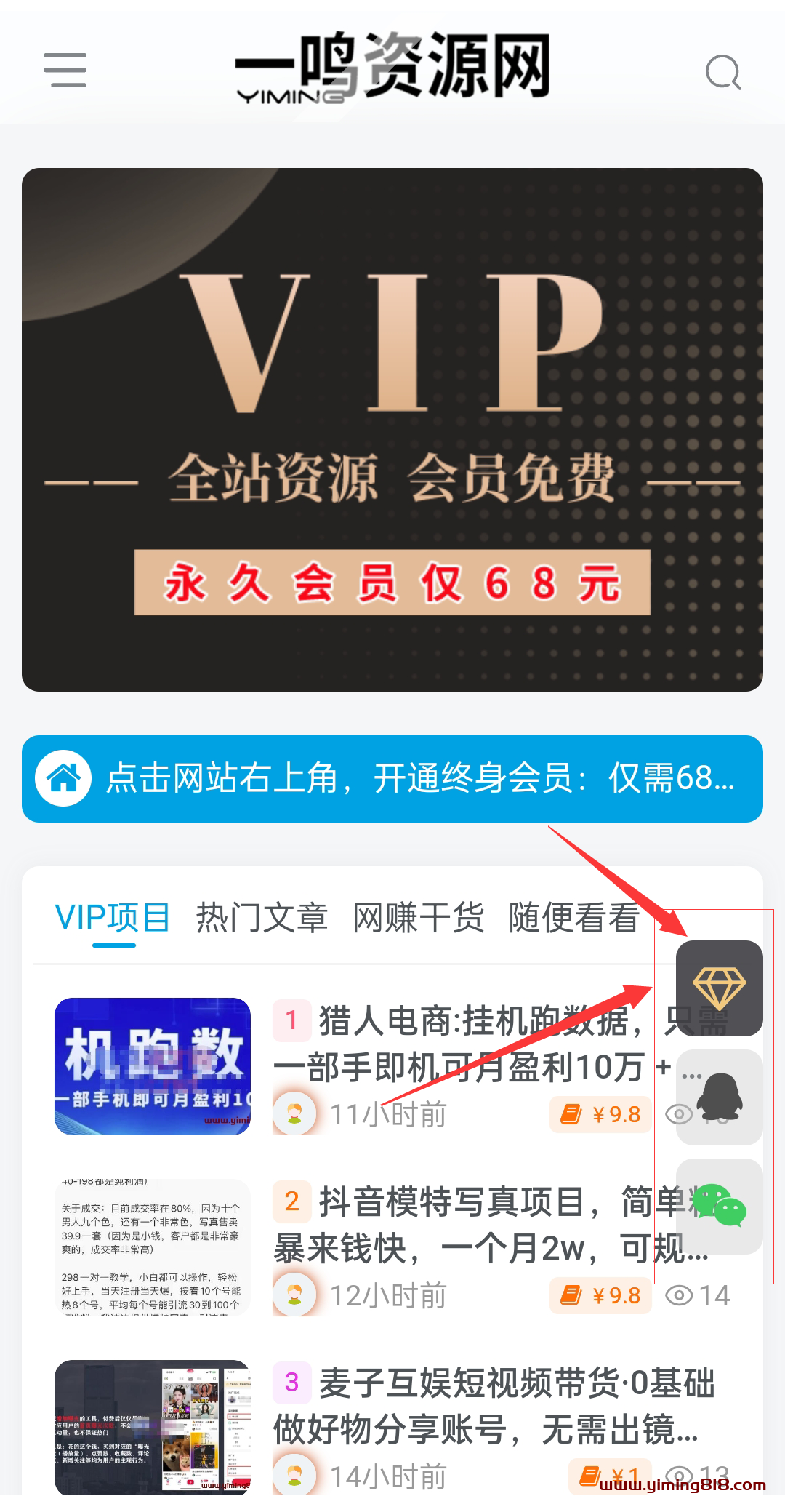 2,手机端(如图),登录后点击那个小钻石,即可在线支付选项:![图片[2]-仅需68元加入一鸣资源网会员,享受全站VIP资源敞开下载-一鸣资源网](https://www.yiming818.com/wp-content/uploads/2022/03/0ff5a6400145.png)