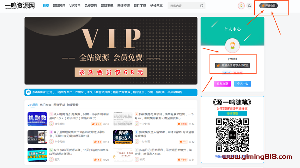 仅需68元加入一鸣资源网会员,享受全站VIP资源免费下载
